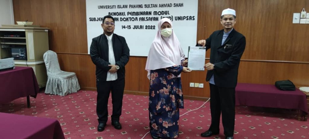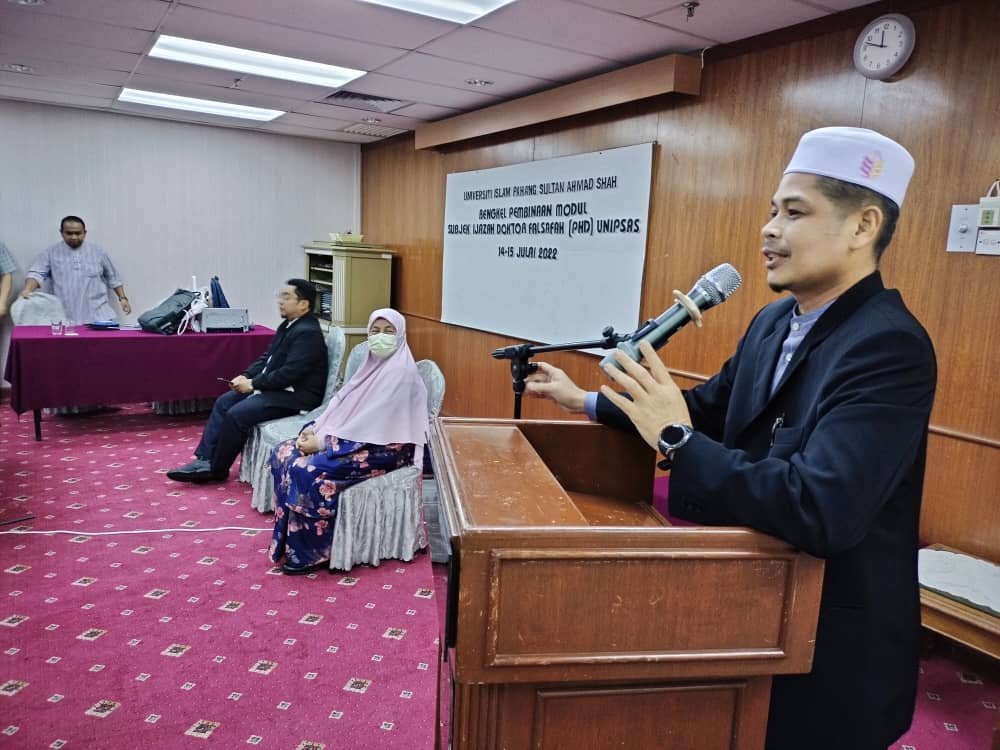 15 JULAI 2022 (KUANTAN) – Program anjuran bersama Fakulti Pengajian Islam (FPI) dan Pusat Pengurusan Siswazah (PPS) UnIPSAS telah selesai mengadakan Bengkel Pembinaan Modul bagi subjek Ijazah Doktor Falsafah (PhD) bermula 15 Jun 2022 hingga 15 Julai 2022 yang dikelolakan oleh pihak Jabatan Quran dan Sunnah.